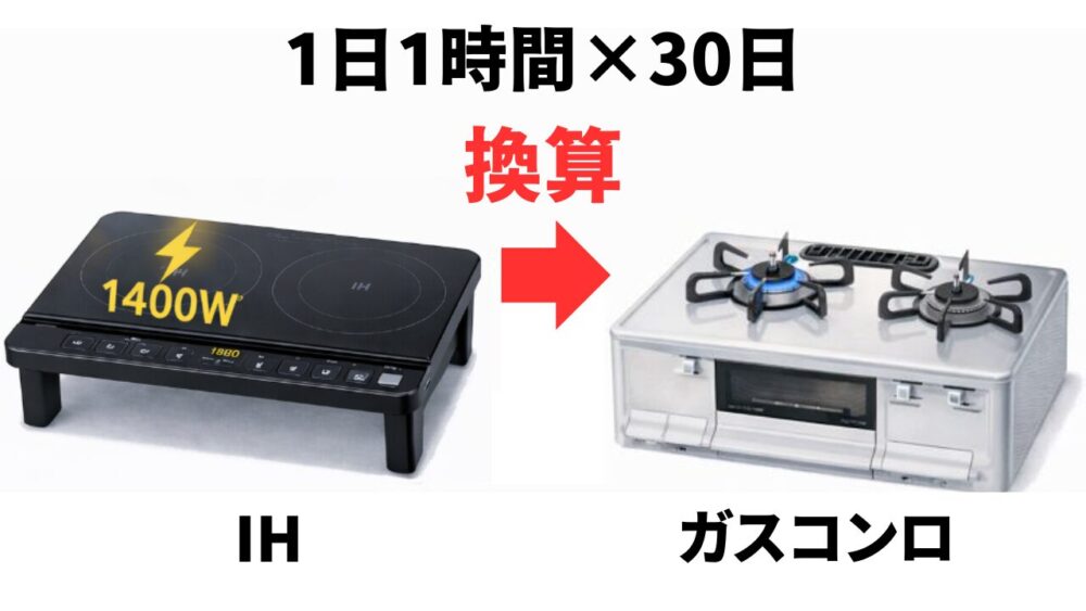 賃貸アパートで多く使われるIHの出力1,400Wのヒーターで1日1時間×30日調理した場合を基準に、熱量換算をおこない、IH・都市ガス・LPガスの1か月の光熱費を比較します。