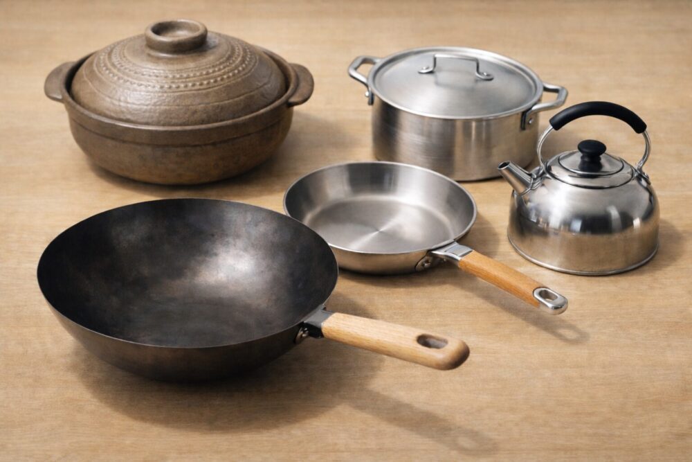 鉄・ステンレスはもちろん、土鍋、アルミ鍋、中華鍋(丸底)まで対応できます。