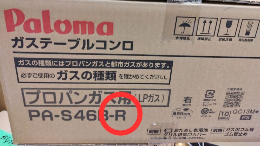 コンロの型番の末尾で、強火力が左右どちらのコンロなのか確認できます。